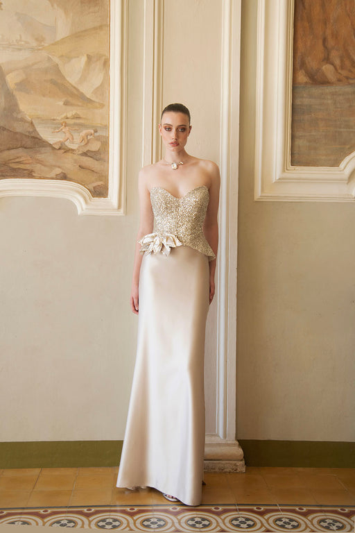 Un abito esclusivo e lussuoso dedicato alle occasioni più magiche e speciali. Abito lungo con corpetto paillettato e stringato con fiore applicabil...
