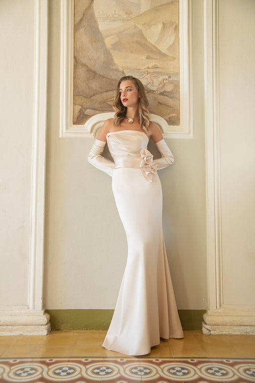 Un abito esclusivo e lussuoso dedicato alle occasioni più magiche e speciali. Abito lungo con fiore applicabile, manicotti e stola. Per la donna ch...