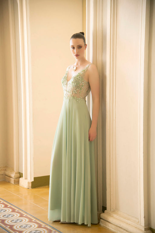 Un abito esclusivo e lussuoso dedicato alle occasioni più magiche e speciali. Abito lungo definito dal corpetto in tulle arricchito da paillettes f...