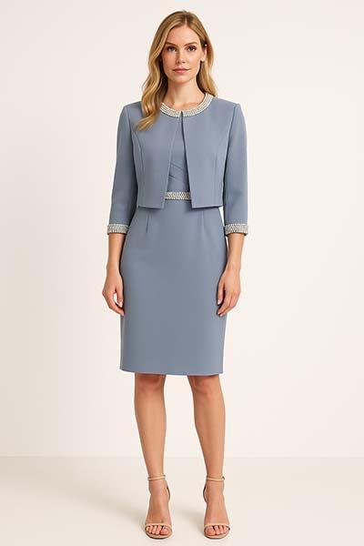 Esclusivo completo due pezzi composto da: abito tubino, con scollatura a V, arricchito da perle nella vita e da giacchino manica lunga con perle su...